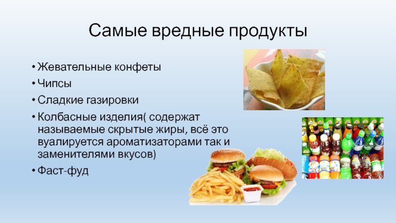 Самые вредные продукты Жевательные конфеты ЧипсыСладкие газировки Колбасные изделия( содержат называемые скрытые жиры, всё это вуалируется ароматизаторами