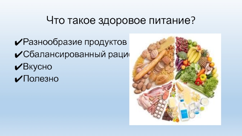 Что такое здоровое питание? Разнообразие продуктовСбалансированный рационВкусноПолезно