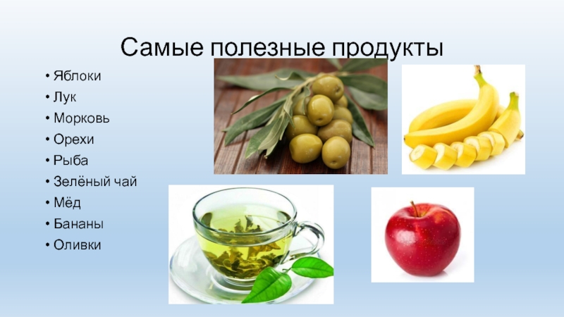 Самые полезные продукты ЯблокиЛукМорковьОрехиРыбаЗелёный чай МёдБананыОливки