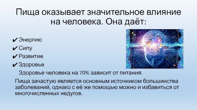Пища оказывает значительное влияние на человека. Она даёт: ЭнергиюСилуРазвитиеЗдоровье Здоровье человека на 70% зависит от питания. Пища зачастую является основным источником большинства заболеваний, однако с её же помощью можно и избавиться от многочисленных недугов.