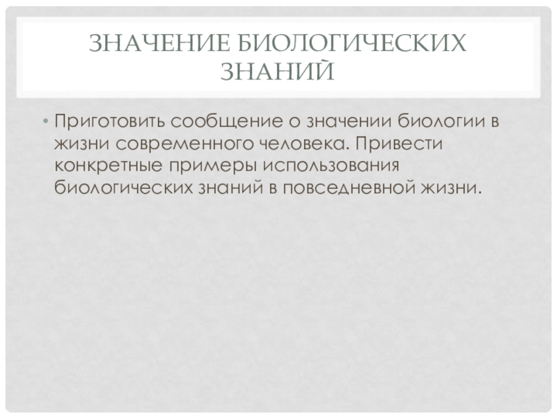 Значение биологических знанийПриготовить сообщение о значении биологии в жизни современного человека. Привести конкретные примеры использования биологических знаний