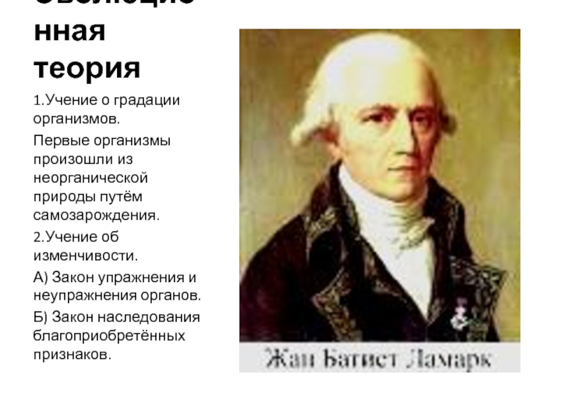 Эволюционная теория 1.Учение о градации организмов.Первые организмы произошли из неорганической природы путём самозарождения.2.Учение об изменчивости.А) Закон упражнения