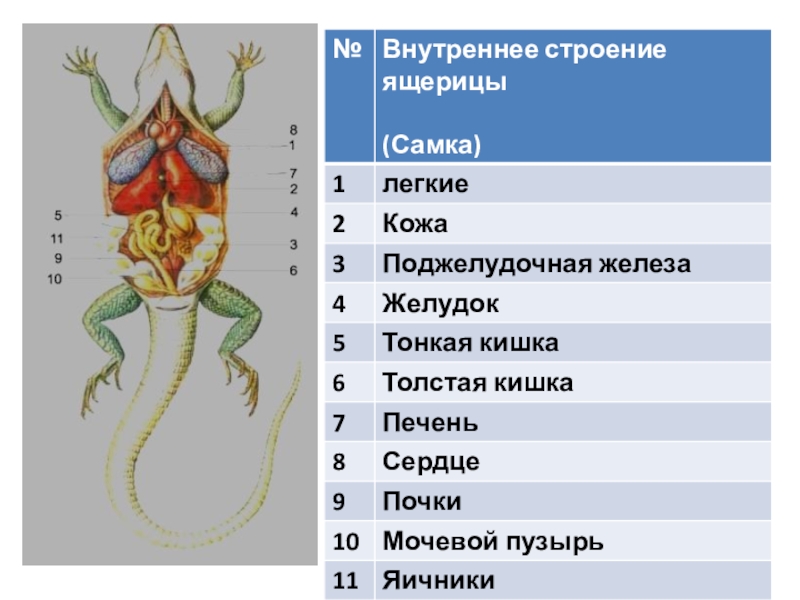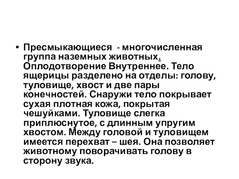 Пресмыкающиеся - многочисленная группа наземных животных. Оплодотворение Внутреннее. Тело ящерицы разделено на отделы: голову, туловище, хвост и