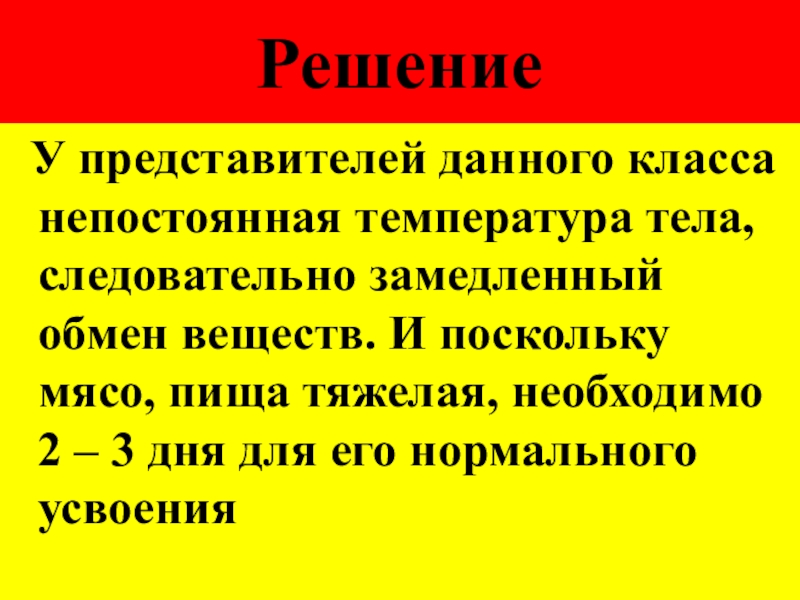 Решение У представителей данного класса непостоянная температура тела, следовательно замедленный обмен веществ. И поскольку мясо, пища тяжелая,