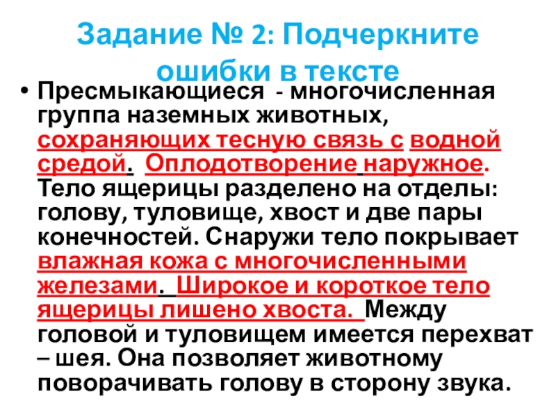Задание № 2: Подчеркните ошибки в текстеПресмыкающиеся - многочисленная группа наземных животных, сохраняющих тесную связь с водной