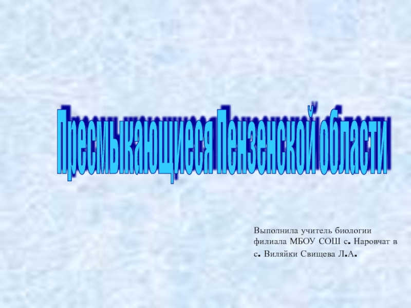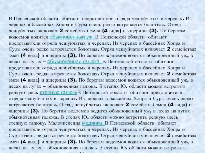 в бассейнах Хопра и Суры очень редко встречается болотная. Отряд чешуйчатых включает 2 семейства: змеи (4 вида) и ящерицы (3). По берегам водоемов водится обыкновенный уж, В Пензенской области обитают представители отряда чешуйчатых и черепах. Из черепах в бассейнах Хопра и Суры очень редко встречается болотная. Отряд чешуйчатых включает 2 семейства: змеи (4 вида) и ящерицы (3). По берегам водоемов водится обыкновенный уж, в лесах на лугах – обыкновенная гадюка. В Пензенской области обитают представители отряда чешуйчатых и черепах. Из черепах в бассейнах Хопра и Суры очень редко встречается болотная. Отряд чешуйчатых включает 2 семейства: змеи (4 вида) и ящерицы (3). По берегам водоемов водится обыкновенный уж, в лесах на лугах – обыкновенная гадюка. В степях Ю. области можно встретить редкую здесь степную гадюкуВ Пензенской области обитают представители отряда чешуйчатых и черепах. Из черепах в бассейнах Хопра и Суры очень редко встречается болотная. Отряд чешуйчатых включает 2 семейства: змеи (4 вида) и ящерицы (3). По берегам водоемов водится обыкновенный уж, в лесах на лугах – обыкновенная гадюка. В степях Ю. области можно встретить редкую здесь степную гадюку. Малочисленна медянка, В Пензенской области обитают представители отряда чешуйчатых и черепах. Из черепах в бассейнах Хопра и Суры очень редко встречается болотная. Отряд чешуйчатых включает 2 семейства: змеи (4 вида) и ящерицы (3). По берегам водоемов водится обыкновенный уж, в лесах на лугах – обыкновенная гадюка. В степях Ю. области можно встретить редкую здесь степную гадюку. Малочисленна медянка, населяющая сухие леса. Здесь же обитает безногая ящерица веретеница. В Пензенской области обитают представители отряда чешуйчатых и черепах. Из черепах в бассейнах Хопра и Суры очень редко встречается болотная. Отряд чешуйчатых включает 2 семейства: змеи (4 вида) и ящерицы (3). По берегам водоемов водится обыкновенный уж, в лесах на лугах – обыкновенная гадюка. В степях Ю. области можно встретить редкую здесь степную гадюку. Малочисленна медянка, населяющая сухие леса. Здесь же обитает безногая ящерица веретеница. Живородящая ящерица В Пензенской области обитают представители отряда чешуйчатых и черепах. Из черепах в бассейнах Хопра и Суры очень редко встречается болотная. Отряд чешуйчатых включает 2 семейства: змеи (4 вида) и ящерицы (3). По берегам водоемов водится обыкновенный уж, в лесах на лугах – обыкновенная гадюка. В степях Ю. области можно встретить редкую здесь степную гадюку. Малочисленна медянка, населяющая сухие леса. Здесь же обитает безногая ящерица веретеница. Живородящая ящерица – коренной житель берегов лесных рек, озер, болот и прилегающих к ним лугов. Все ландшафты населяет прыткая ящерицаВ Пензенской области обитают представители отряда чешуйчатых и черепах. Из черепах в бассейнах Хопра и Суры очень редко встречается болотная. Отряд чешуйчатых включает 2 семейства: змеи (4 вида) и ящерицы (3). По берегам водоемов водится обыкновенный уж, в лесах на лугах – обыкновенная гадюка. В степях Ю. области можно встретить редкую здесь степную гадюку. Малочисленна медянка, населяющая сухие леса. Здесь же обитает безногая ящерица веретеница. Живородящая ящерица – коренной житель берегов лесных рек, озер, болот и прилегающих к ним лугов. Все ландшафты населяет прыткая ящерица