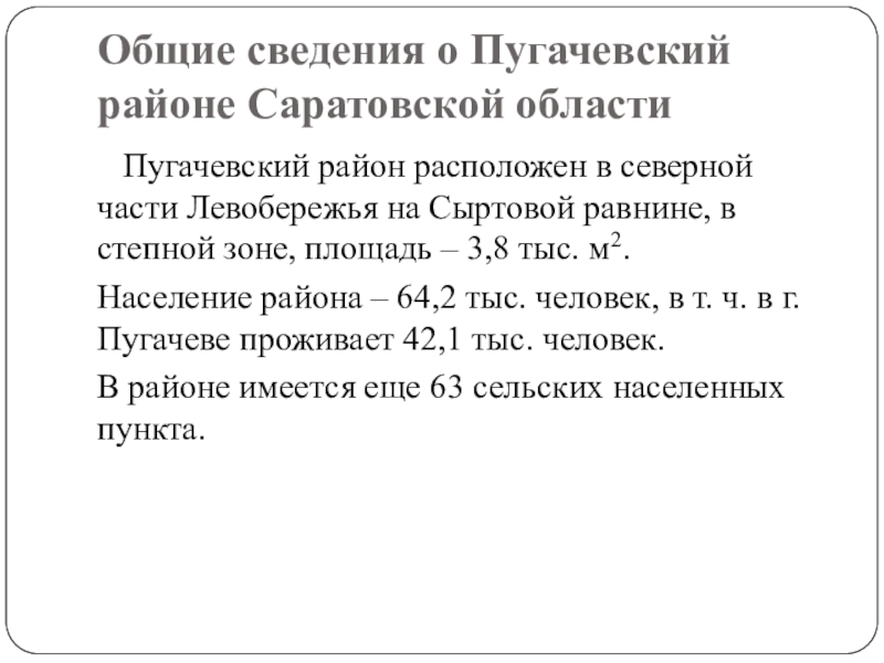 Общие сведения о Пугачевский районе Саратовской области  Пугачевский район расположен в северной части Левобережья на Сыртовой