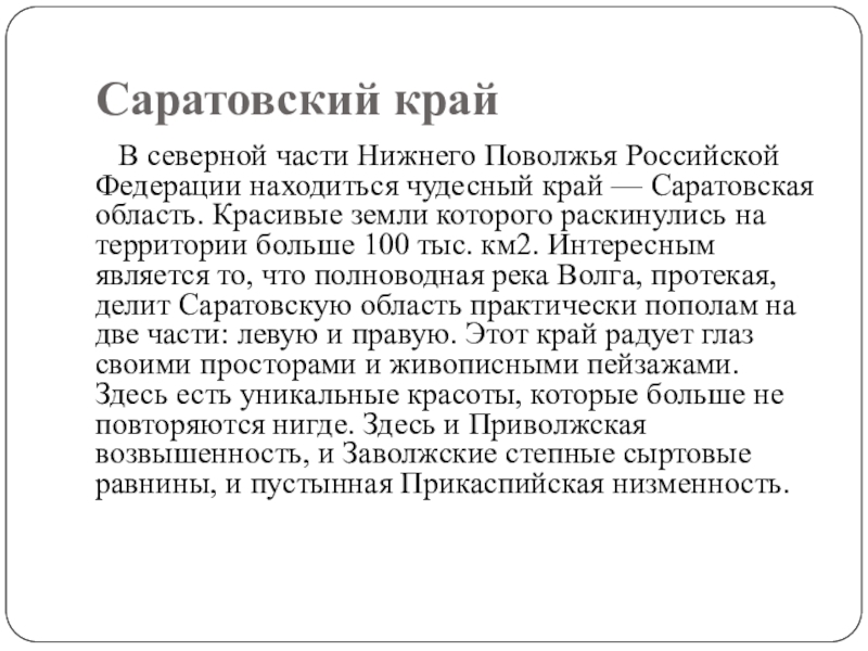 Саратовский край В северной части Нижнего Поволжья Российской Федерации находиться чудесный край — Саратовская область. Красивые земли которого раскинулись на территории больше 100 тыс. км2. Интересным является то, что полноводная река Волга, протекая, делит Саратовскую