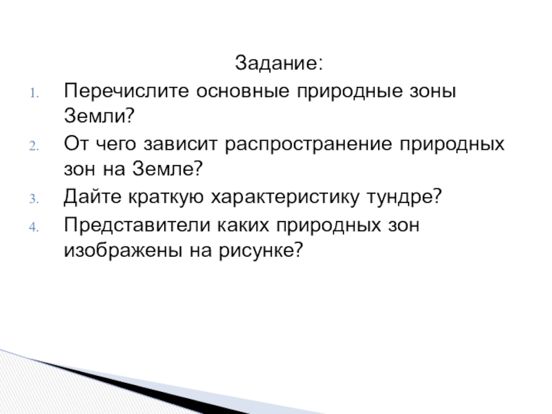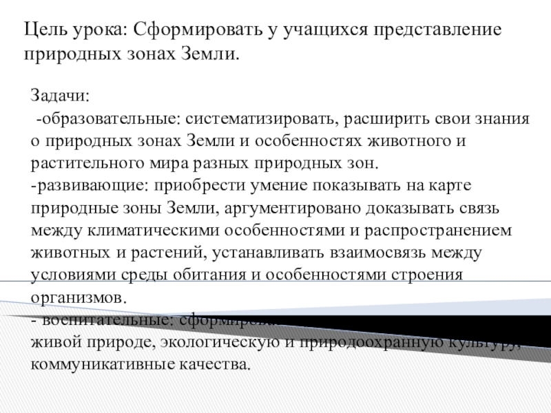 Цель урока: Сформировать у учащихся представление природных зонах Земли.