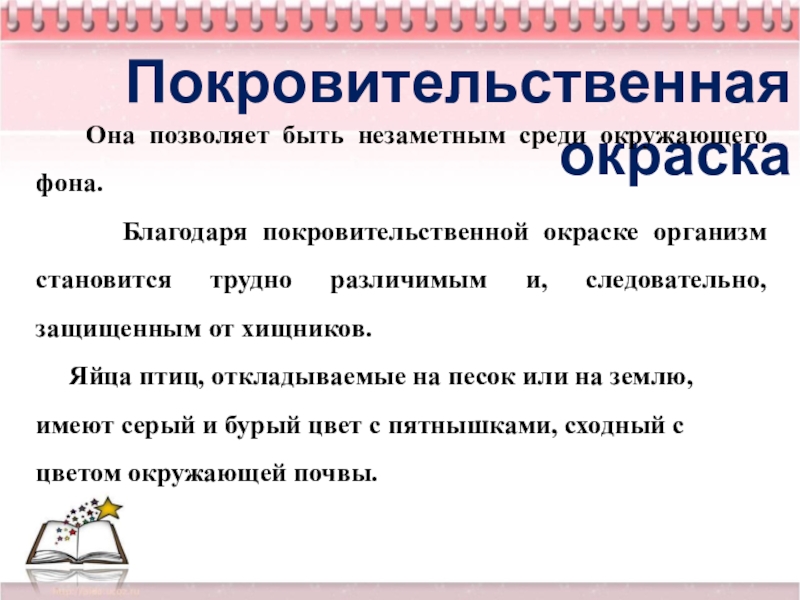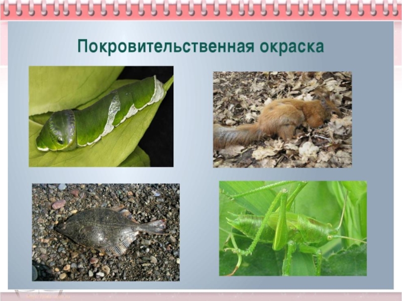 Благодаря покровительственной окраске организм становится трудно различимым и, следовательно, защищенным от хищников.