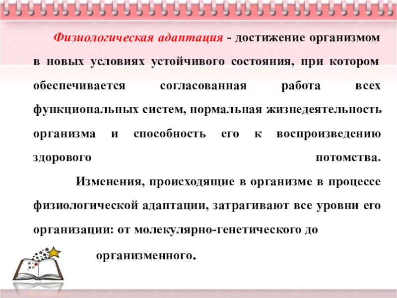 Слайд 27 Физиологическая адаптация - достижение организмом в новых условиях устойчивого