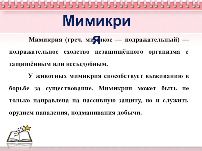 Слайд 17 Мимикрия (греч. мимикос — подражательный) — подражательное