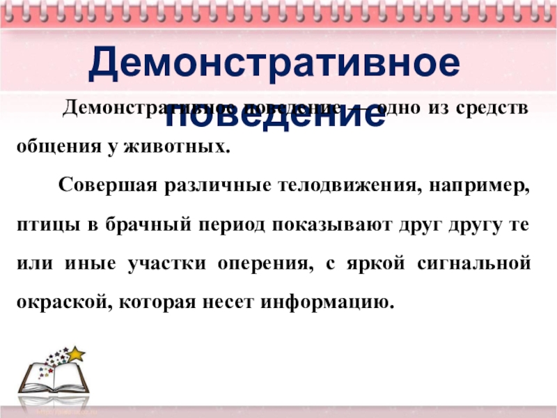 Совершая различные телодвижения, например, птицы в брачный период показывают друг другу те или иные участки оперения, с яркой сигнальной окраской, которая несет информацию.