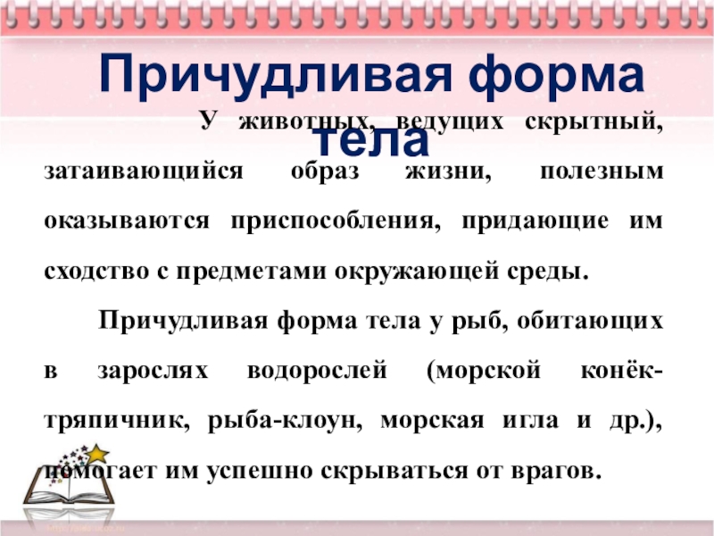 Причудливая форма тела у рыб, обитающих в зарослях водорослей (морской конёк-тряпичник, рыба-клоун, морская игла и др.), помогает им успешно скрываться от врагов.