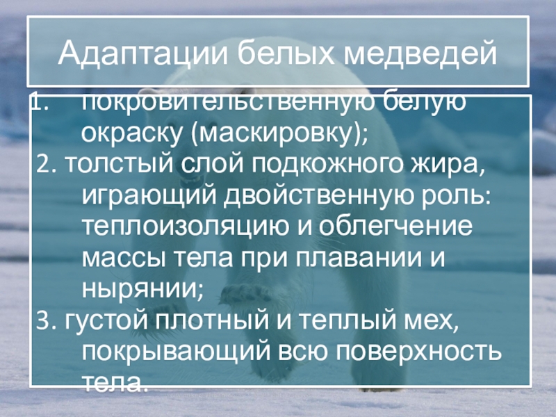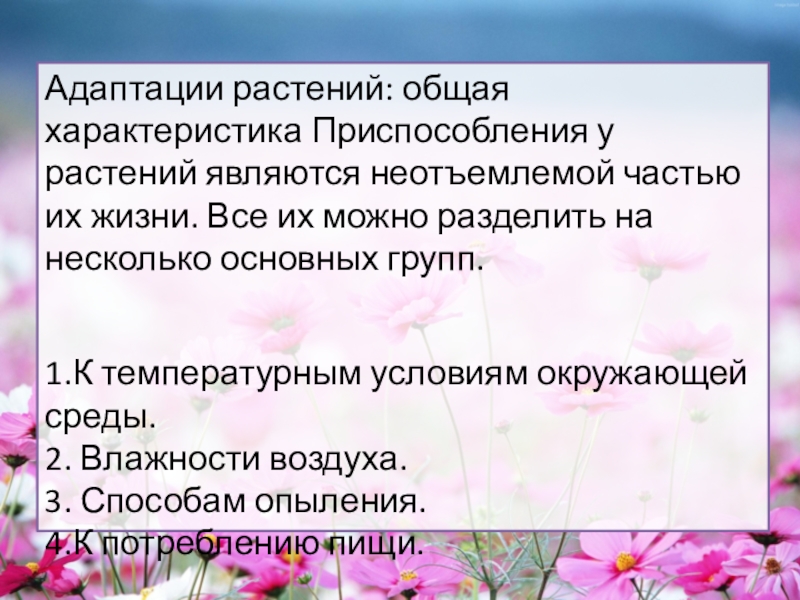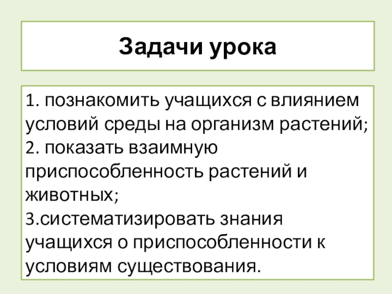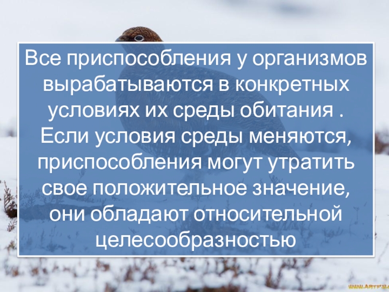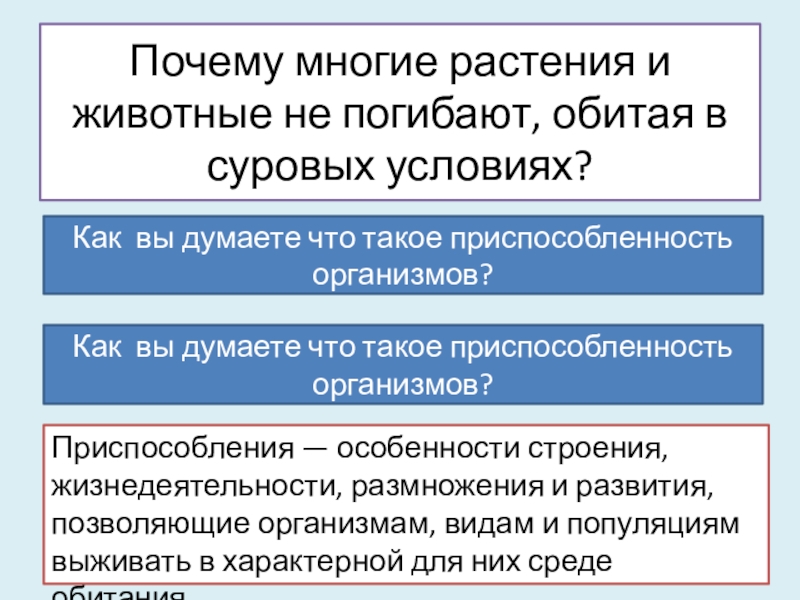 Приспособления — особенности строения, жизнедеятельности, размножения и развития, позволяющие организмам, видам и популяциям выживать в характерной для них среде обитания.