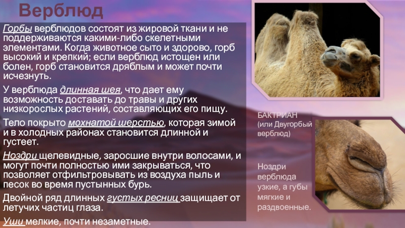 Ноздри верблюда узкие, а губы мягкие и раздвоенные.