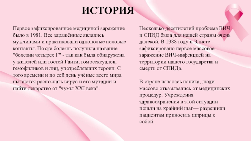 Несколько десятилетий проблема ВИЧ и СПИД была для нашей страны очень далекой. В 1988 году в Элисте зафиксировано первое массовое заражение ВИЧ-инфекцией на территории нашего государства и смерть от СПИДа.