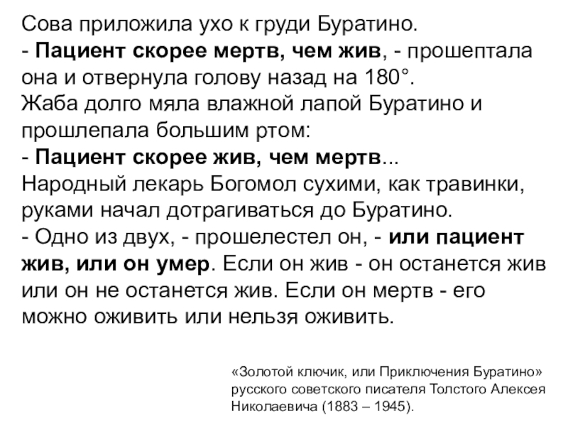 «Золотой ключик, или Приключения Буратино» русского советского писателя Толстого Алексея Николаевича (1883 – 1945).