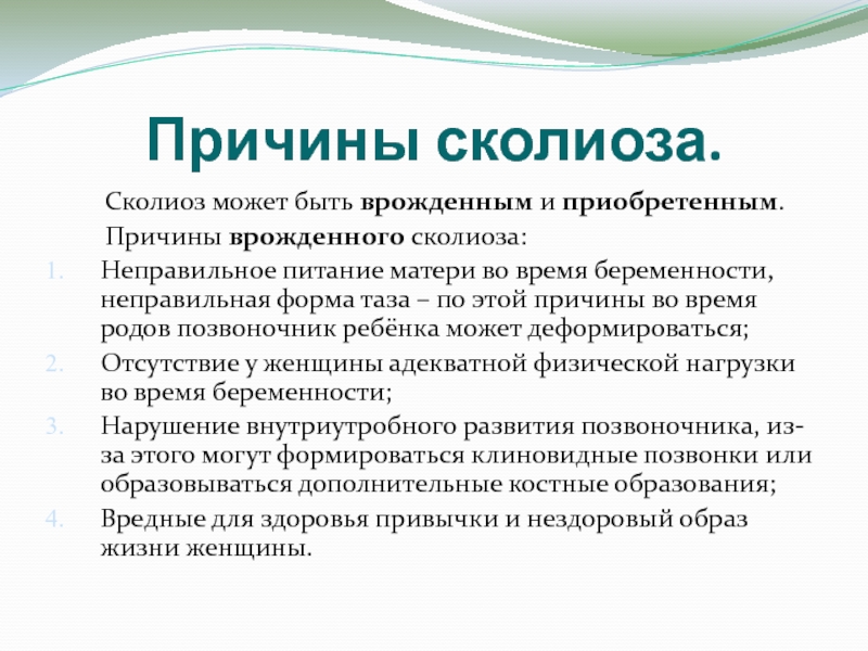 Неправильное питание матери во время беременности, неправильная форма таза – по этой причины во время родов позвоночник ребёнка может деформироваться;