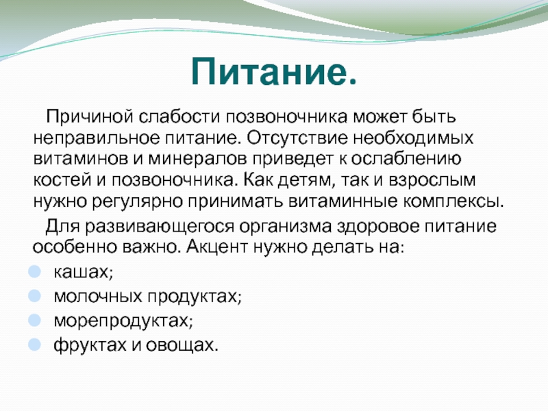 Причиной слабости позвоночника может быть неправильное питание. Отсутствие необходимых