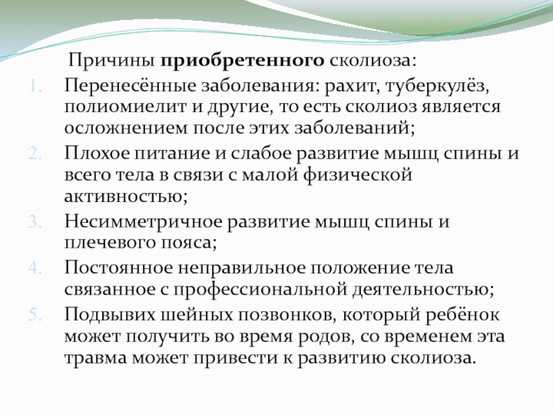 полиомиелит и другие, то есть сколиоз является осложнением после этих заболеваний;