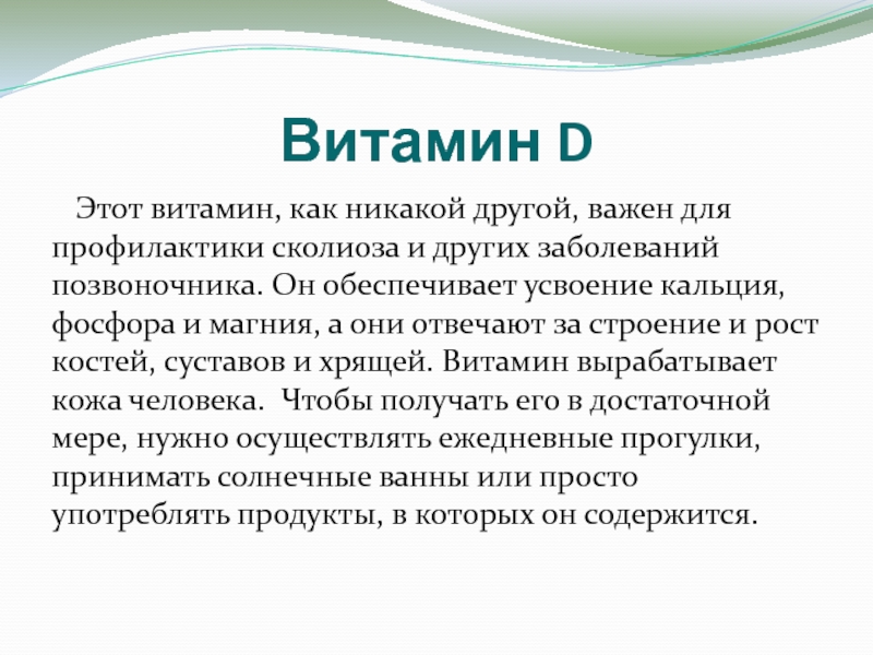 сколиоза и других заболеваний позвоночника. Он обеспечивает усвоение кальция, фосфора и магния, а они отвечают за строение и рост костей, суставов и хрящей. Витамин вырабатывает кожа человека. Чтобы получать его в достаточной мере, нужно осуществлять ежедневные прогулки, принимать солнечные ванны или просто употреблять продукты, в которых он содержится.