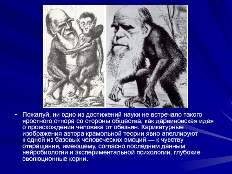 со стороны общества, как дарвиновская идея о происхождении человека от обезьян. Карикатурные изображения автора крамольной теории явно апеллируют к одной из базовых человеческих эмоций — к чувству отвращения, имеющему, согласно последним данным нейробиологии и экспериментальной психологии, глубокие эволюционные корни.