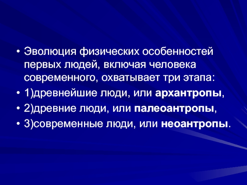Эволюция физических особенностей первых людей, включая человека современного, охватывает три этапа: