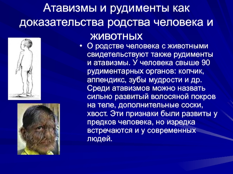 с животными свидетельствуют также рудименты и атавизмы. У человека свыше 90 рудиментарных органов: копчик, аппендикс, зубы мудрости и др. Среди атавизмов можно назвать сильно развитый волосяной покров на теле, дополнительные соски, хвост. Эти признаки были развиты у предков человека, но изредка встречаются и у современных людей.