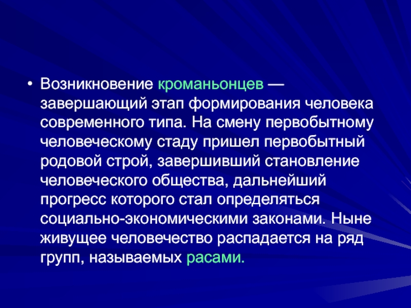 Возникновение кроманьонцев — завершающий этап формирования человека современного типа. На смену