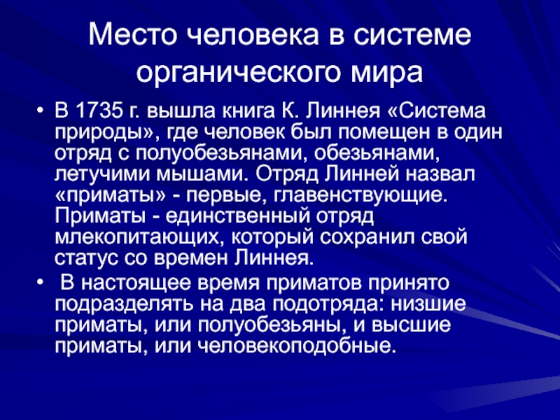 Линнея «Система природы», где человек был помещен в один отряд с полуобезьянами, обезьянами, летучими мышами. Отряд Линней назвал «приматы» - первые, главенствующие. Приматы - единственный отряд млекопитающих, который сохранил свой статус со времен Линнея.