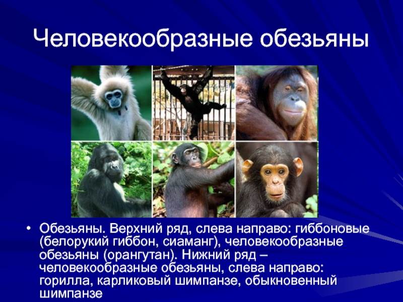 Обезьяны. Верхний ряд, слева направо: гиббоновые (белорукий гиббон, сиаманг), человекообразные