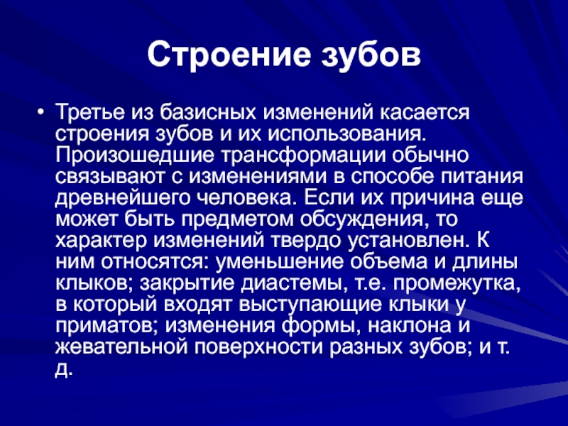 Произошедшие трансформации обычно связывают с изменениями в способе питания древнейшего человека. Если их причина еще может быть предметом обсуждения, то характер изменений твердо установлен. К ним относятся: уменьшение объема и длины клыков; закрытие диастемы, т.е. промежутка, в который входят выступающие клыки у приматов; изменения формы, наклона и жевательной поверхности разных зубов; и т. д.