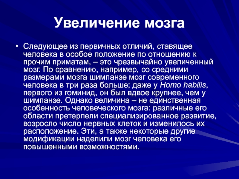 отношению к прочим приматам, – это чрезвычайно увеличенный мозг. По сравнению, например, со средними размерами мозга шимпанзе мозг современного человека в три раза больше; даже у Homo habilis, первого из гоминид, он был вдвое крупнее, чем у шимпанзе. Однако величина – не единственная особенность человеческого мозга: различные его области претерпели специализированное развитие, возросло число нервных клеток и изменилось их расположение. Эти, а также некоторые другие модификации наделили мозг человека его повышенными возможностями.