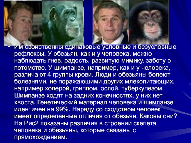 у человека, можно наблюдать гнев, радость, развитую мимику, заботу о потомстве. У шимпанзе, например, как и у человека, различают 4 группы крови. Люди и обезьяны болеют болезнями, не поражающими других млекопитающих, например холерой, гриппом, оспой, туберкулезом. Шимпанзе ходят на задних конечностях, у них нет хвоста. Генетический материал человека и шимпанзе идентичен на 99%. Наряду со сходством человек имеет определенные отличия от обезьян. Каковы они? На Рис2 показаны различия в строении скелета человека и обезьяны, которые связаны с прямохождением.