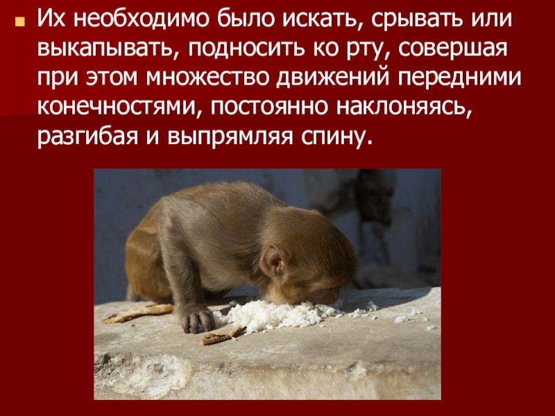 Слайд 9Их необходимо было искать, срывать или выкапывать, подносить ко рту, совершая
