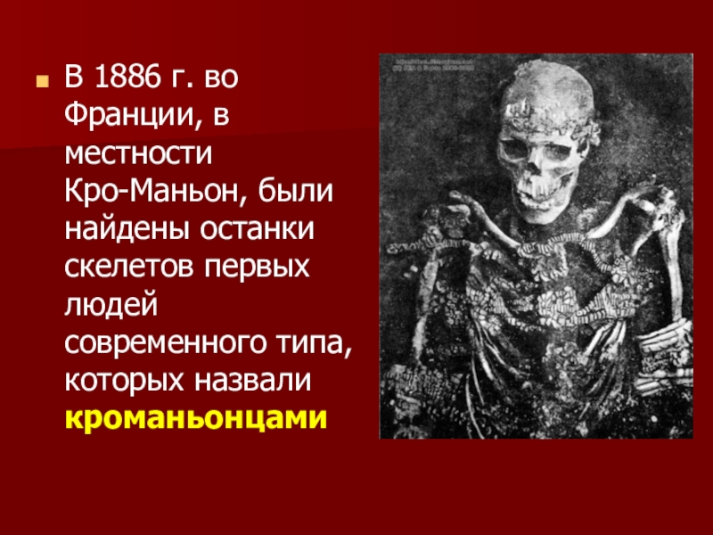 Кро-Маньон, были найдены останки скелетов первых людей современного типа, которых назвали кроманьонцами