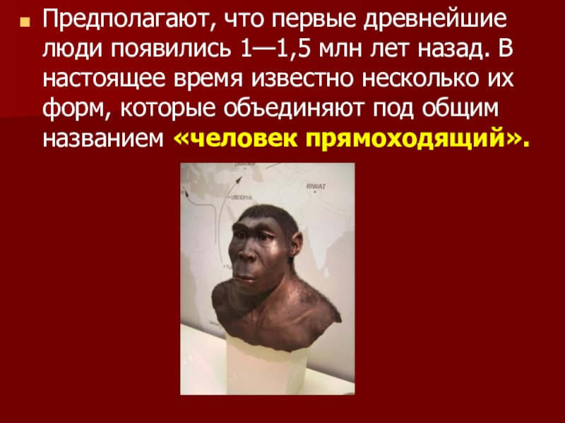 Слайд 20Предполагают, что первые древнейшие люди появились 1—1,5 млн лет назад. В