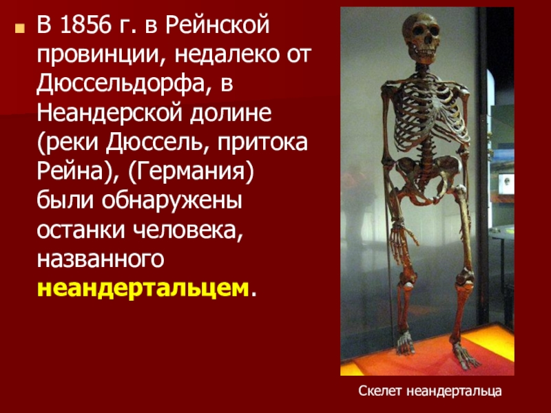 Слайд 27В 1856 г. в Рейнской провинции, недалеко от Дюссельдорфа, в Неандерской