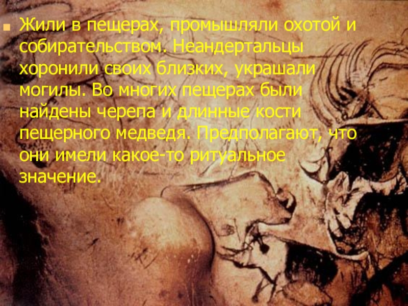 Слайд 35Жили в пещерах, промышляли охотой и собирательством. Неандертальцы хоронили своих близких,