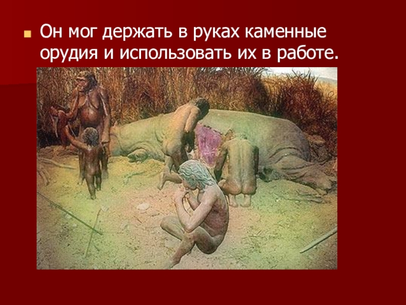 Слайд 18Он мог держать в руках каменные орудия и использовать их в