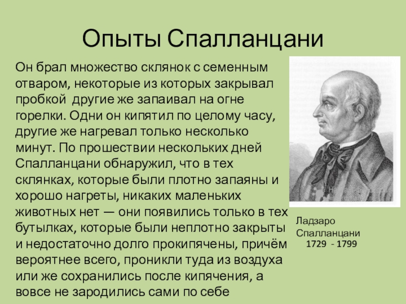 закрывал пробкой другие же запаивал на огне горелки. Одни он кипятил по целому часу, другие же нагревал только несколько минут. По прошествии нескольких дней Спалланцани обнаружил, что в тех склянках, которые были плотно запаяны и хорошо нагреты, никаких маленьких животных нет — они появились только в тех бутылках, которые были неплотно закрыты и недостаточно долго прокипячены, причём вероятнее всего, проникли туда из воздуха или же сохранились после кипячения, а вовсе не зародились сами по себе