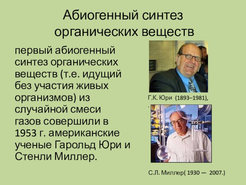 участия живых организмов) из случайной смеси газов совершили в 1953 г. американские ученые Гарольд Юри и Стенли Миллер.