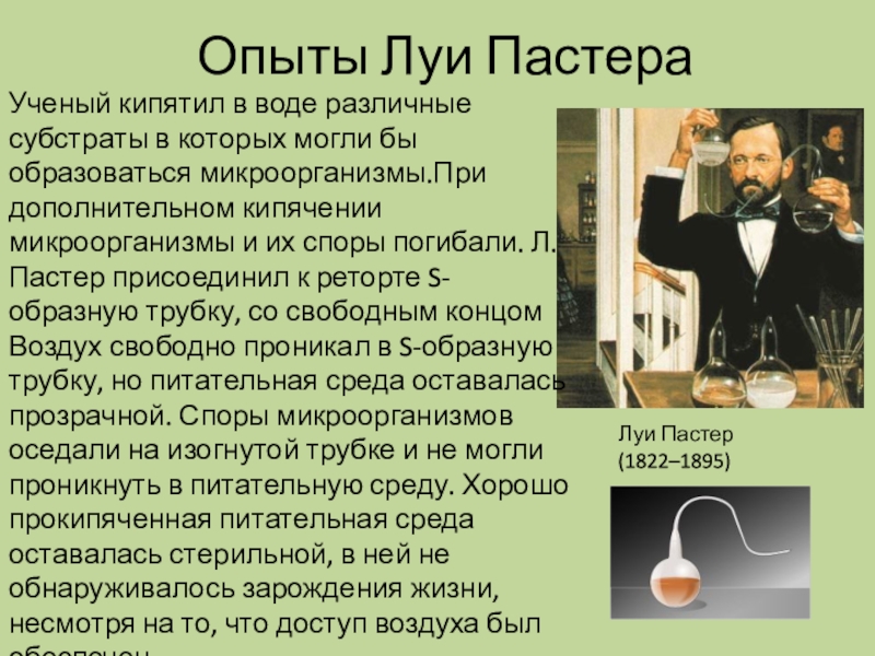 бы образоваться микроорганизмы.При дополнительном кипячении микроорганизмы и их споры погибали. Л. Пастер присоединил к реторте S-образную трубку, со свободным концом Воздух свободно проникал в S-образную трубку, но питательная среда оставалась прозрачной. Споры микроорганизмов оседали на изогнутой трубке и не могли проникнуть в питательную среду. Хорошо прокипяченная питательная среда оставалась стерильной, в ней не обнаруживалось зарождения жизни, несмотря на то, что доступ воздуха был обеспечен.