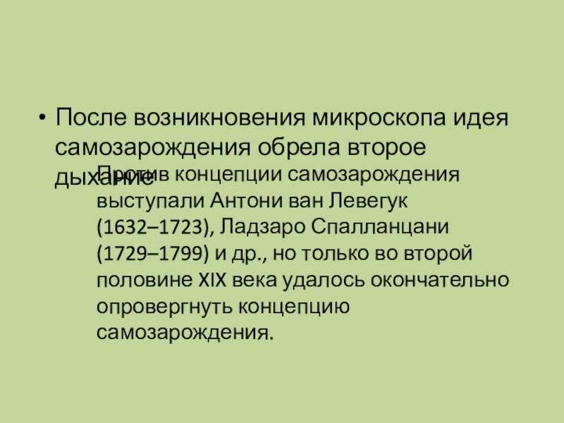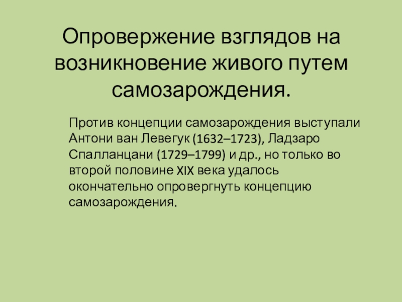 ван Левегук (1632–1723), Ладзаро Спалланцани (1729–1799) и др., но только во второй половине XIX века удалось окончательно опровергнуть концепцию самозарождения.