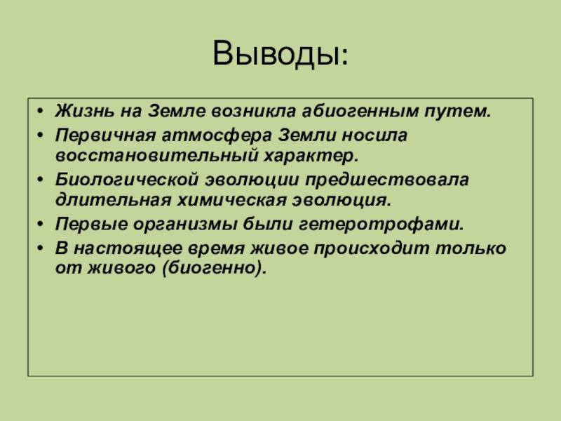 В настоящее время живое происходит только от живого (биогенно).
