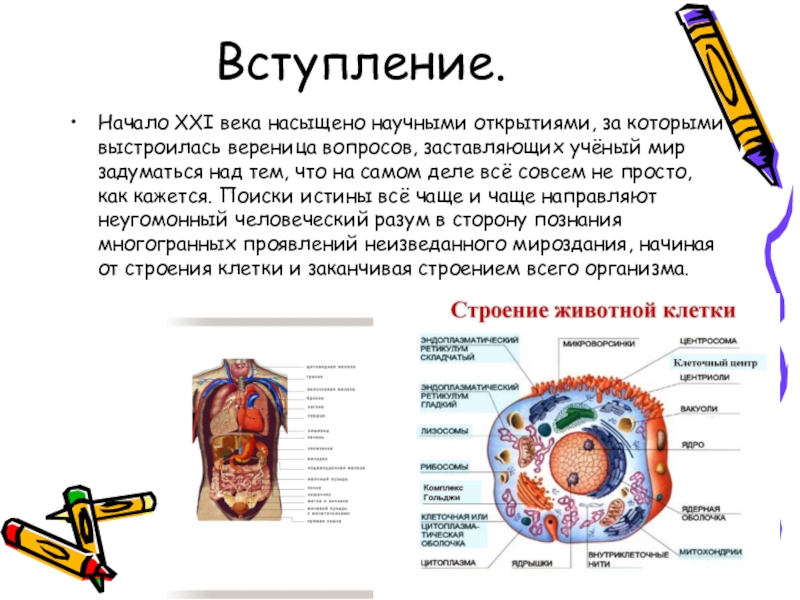 вопросов, заставляющих учёный мир задуматься над тем, что на самом деле всё совсем не просто, как кажется. Поиски истины всё чаще и чаще направляют неугомонный человеческий разум в сторону познания многогранных проявлений неизведанного мироздания, начиная от строения клетки и заканчивая строением всего организма.