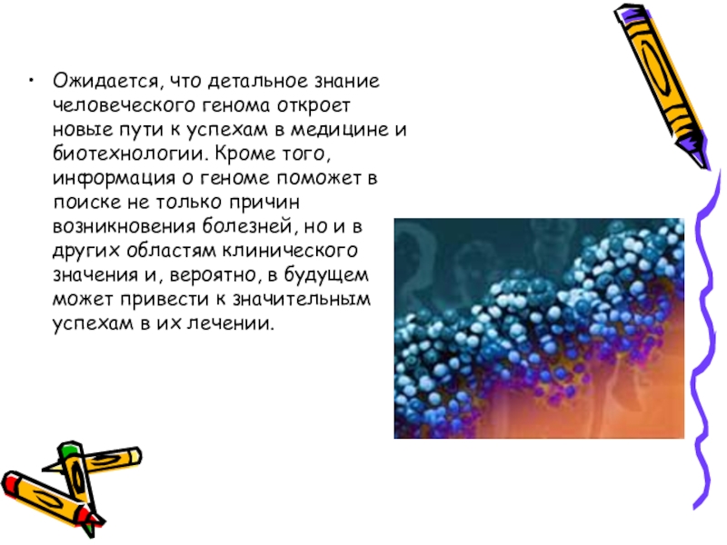 в медицине и биотехнологии. Кроме того, информация о геноме поможет в поиске не только причин возникновения болезней, но и в других областям клинического значения и, вероятно, в будущем может привести к значительным успехам в их лечении.