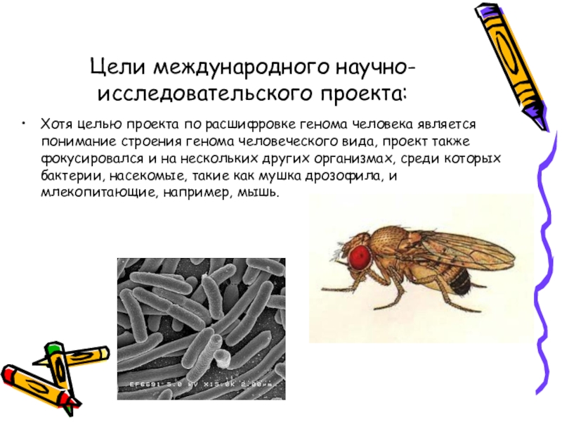 понимание строения генома человеческого вида, проект также фокусировался и на нескольких других организмах, среди которых бактерии, насекомые, такие как мушка дрозофила, и млекопитающие, например, мышь.