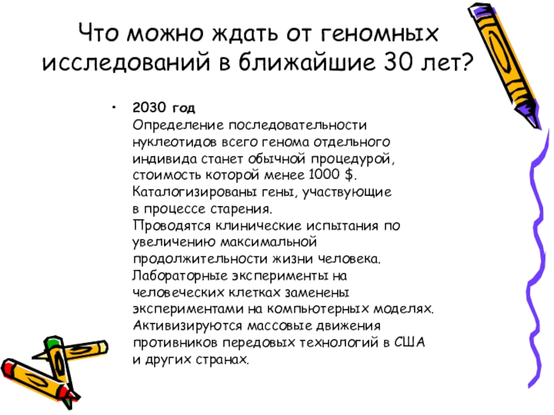 Слайд 12Что можно ждать от геномных исследований в ближайшие 30 лет?